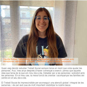 "Quan vaig dedcidir estudiar Treball Social sempre tenia en ment que volia ajudar les persones. Avui, tres anys després d'haver començat a exercir, penso que aquella idea que tenia és la que em mou dia a dia, treballar per a les persones i sobretot amb les persones. En el meu cas, la meva funció és orientar i acompanya les famílies del centre en el seu dia a dia.