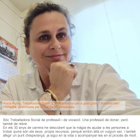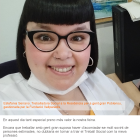 "En el poc temps que porto com a Treballadora Social he arribat al convenciment que la meva tasca, i de totes les Treballadores Socials, aporta molt en el dia a dia de les persones usuàries. No només les orientem sinó també a les seves famílies en un procés, que tot i que molts cops és el més adient per a les persones gran amb dependència, no deixa de ser difícil per a tots.