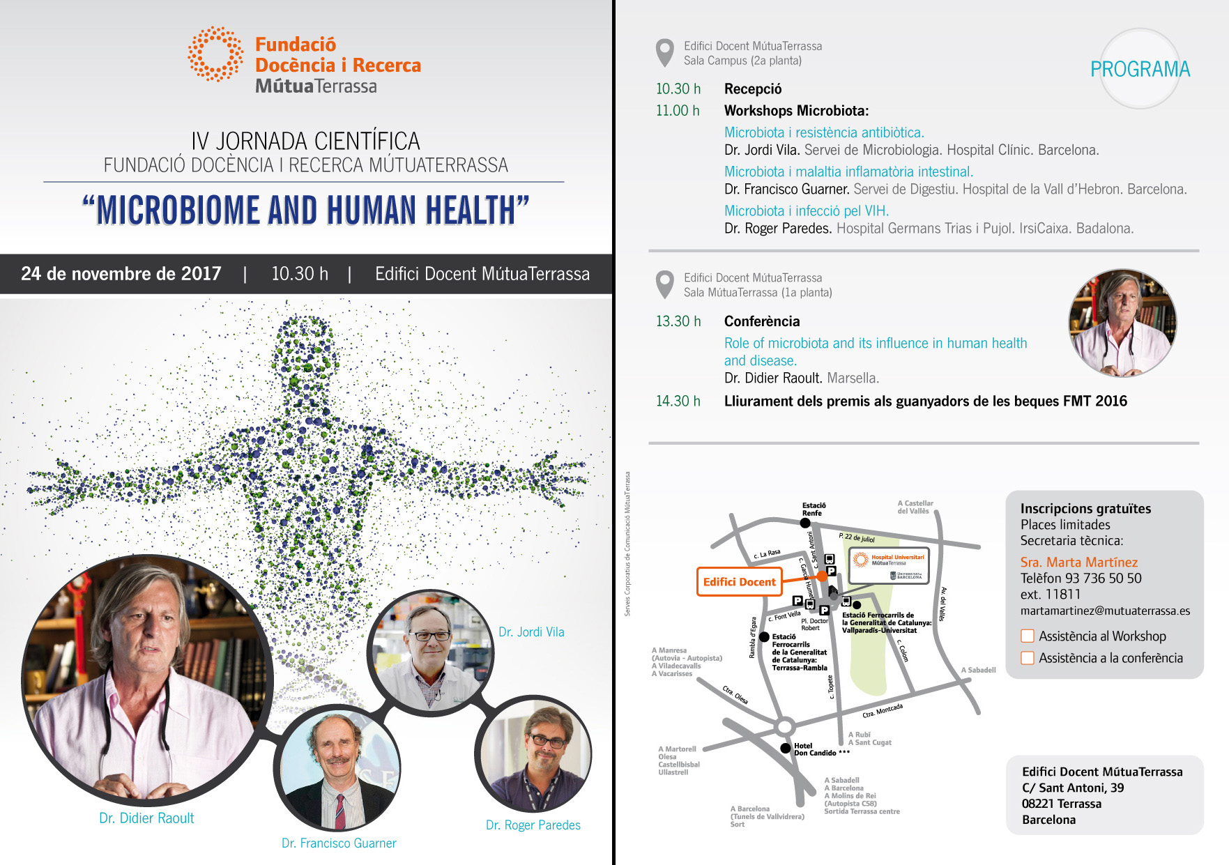 Contará con la participación del Dr. Didier Raoult, reconocido microbiólogo francés especializado en enfermedades infecciosas. El próximo viernes, 24 de noviembre, la Fundación Docencia e Investigación MútuaTerrassa celebrará la cuarta edición de la jornada científica que organiza periódicamente con el propósito de poner en valor su labor científica e investigadora. En esta ocasión el tema elegido es el microbioma (el conjunto de microorganismos que habitan en el cuerpo humano, teniendo en cuenta sus genomas y su interrelación con el organismo) y la salud humana. La sesión contempla un workshop alrededor del Microbiota que ocurrirá entre las 11 y las 13h. En este sentido, se abordará desde tres prismas diferentes: "Microbiota y resistencia antibiótica", a cargo del Dr. Jordi Vila del Servicio de Microbiología del Hospital Clínico de Barcelona, "Microbiota y enfermedad inflamatoria intestinal", a cargo del Dr. Francisco Guarner del Servicio de Digestivo del Hospital Vall d'Hebrón de Barcelona y "Microbiota e infección por VIH", a cargo del Dr. Roger Paredes del Hospital Germans Trias i Pujol y del IrsiCaixa de Badalona.