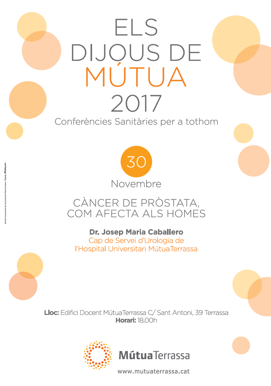El próximo jueves 30 de noviembre, a las 18.00h en el edificio docente de MútuaTerrassa, tendrá lugar la última conferencia del ciclo del Jueves de Mutua 2017, bajo el título: "Cáncer de próstata, cómo afecta a los hombres", que correrá a cargo del Dr. Josep Maria Caballero, jefe de Servicio de Urología del Hospital Universitario MútuaTerrassa. En este sentido, la Dr. Josep Maria Caballero hablará sobre los factores de riesgo relacionados con el cáncer de próstata, ya que se trata del segundo cáncer más frecuente diagnosticado en nuestro país y el quinto con mayor mortalidad. La única forma para detectar a tiempo este tipo de cáncer es informándose sobre las pruebas a realizar a través de los médicos de familia o el urólogo. "Els Dijous de Mútua" nacieron en 2003 para divulgar temas médicos de actualidad e informar de una manera comprensible sobre todo aquello que preocupa a la sociedad. Las conferencias son de carácter gratuito y no requieren confirmación previa. ¡Os esperamos!