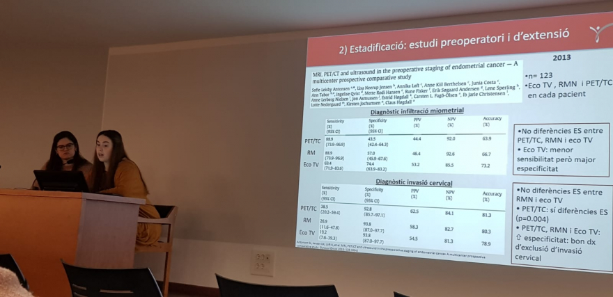 El Dr. Jordi Rodríguez y la Dra. Nuria Baras intervinieron al Curso Actualización en cáncer de endometrio, organizado por la Sección Catalana de Ginecología Oncológica y Patología Mamaria de la Sociedad Catalana de Obstetricia y Ginecología y dirigido a residentes, como tutor y miembro de la unidad de cáncer ginecológico, el primero, y médico residente, la segunda. La Dra. Baras presentó de la primera tabla de Cáncer endometrio tipo I (Caso clínico): Factores de riesgo / protectores, diagnóstico y estadificación (ECO TV vs RMN), factores adicionales de mal pronóstico, grupos de recidiva, seguimiento post tratamiento.