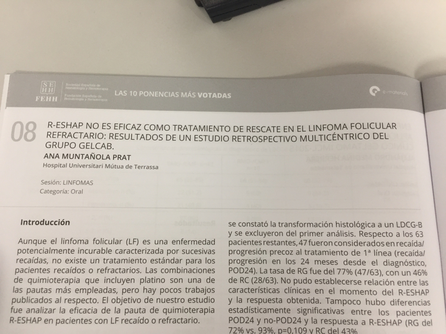 La semana pasada se hizo público el libro de recopilación de las mejores ponencias y conclusiones que se recogieron del LX congreso de la Sociedad Español de Hematología y Hemoterapia, que tuvo lugar en Granada el pasado mes de octubre.Entre las 10 ponencias más destacadas se encuentra: R-ESHAP no es eficaz como Tratamiento de rescate en el linfoma folicular refractario: Resultados de un estudio retrospectivo multicéntrico del grupo GELCAB. Esta ponencia estuvo a cargo de la Dra. Ana Muntañola, médico adjunta del servicio de Hematología del HUMT, en la que se describe los resultados de la administración del tratamiento de quimioterapia R-ESHAP en pacientes con linfoma folicular refractario en 9 centros que pertenecen al grupo GELCAB, entre los que se encuentra HUMT.